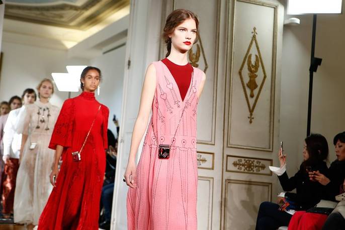 He took Valentino’s signatures frothy tulles and romantic laces and reworked them into more casual dresses, all slung with miniature cross body bags for a supplemental on-the-go feel. From red-carpet pleated skirts, long-sleeves, and high necks to tulle-skirted gowns with fanned sleeves, he ramped up wear-ability with more everyday offerings, such as gathered trousers, an asymmetric army jacket, and a red crochet dress. One standout piece was a pink fabric coat finished with floral appliqué and a raw edged hem, suitable for the fanciest occasion, as well as for your everyday affairs.