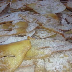 Small stripes of crispy dough fried in oil and covered with powdered sugar. You can find this typical dessert in every region of Italy during the Carnevale season