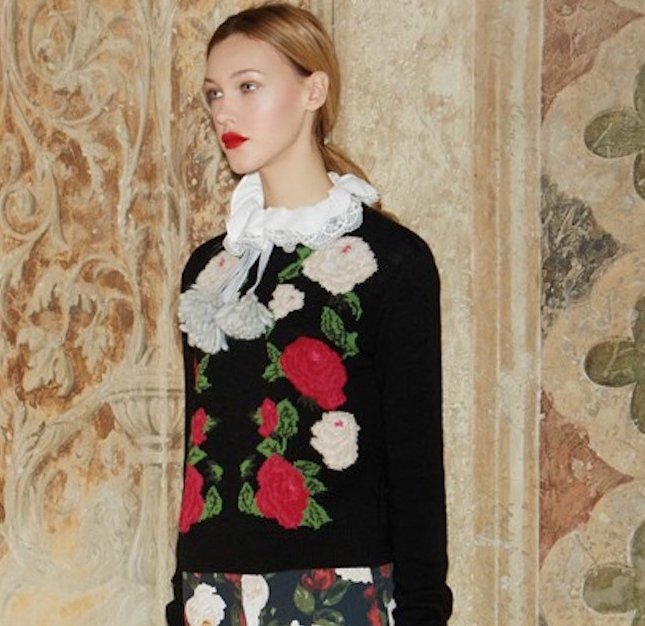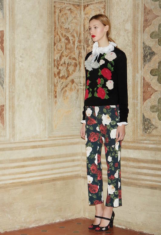 Knitted sweater; plus fluffy shirt; plus red, green, and white roses. Are you still not convinced that this is the perfect Christmas outfit? We suggest copying the entire look, but if the pat- tern/color game is too much for you, feel free to combine the floral pants with a simple black or white sweater, or combine the sweater with a basic pair of pants. Regardless, the result will be stunning, promise!