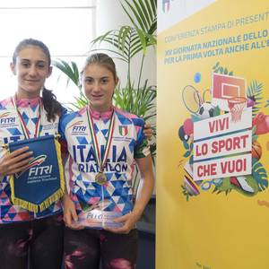 Malagò e Mornati, alla presenza del Presidente della FITRI Luigi Bianchi, hanno premiato Valentina Rosamilia e Nina, due triatlete italo-svizzere che si sono classificate rispettivamente al primo e al terzo posto nella Finale Nazionale dei Campionati di Duathlon svoltisi a Cuneo lo scorso aprile.