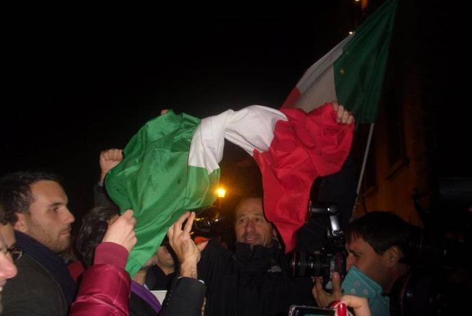 Saviano reads from a printed paper sheet. “I came here in an attempt to feel less lonely, and to remind you all that your protest is not undermining the law, but rather it is to defend it,” he declares while saluting the crowd.