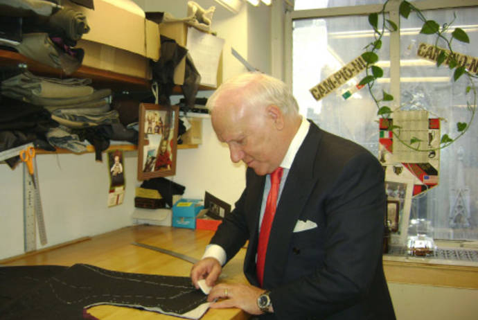 Gli chiedo qual è stato il vestito più buffo che abbia mai realizzato. "Una volta", racconta, "un giovane manager della American Express mi ha chiesto un abito grigio chiaro con le righe gialle, voleva la giacca in doppiopetto, le tasche sovvrapposte, e gli spacchi della giacca molto alti; i pantaloni a zampa di elefante, la giacca svasata. Quando l'ha provato, lui così biondo e alto faceva un certo effetto, era un po' buffo..., ma sai se il cliente è contento sono contento anch'io!."