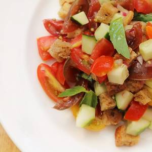 Panzanella is the quintessential dish to throw together when you don't want to go to the store. The classic Tuscan salad calls for only a few simple ingredients: stale bread, misc. produce, and basic seasonings. Centuries ago in Toscana, when bread was baked only once a week, families would use leftover loaves by soaking the stale bread in olive oil and vinegar. The revitalized bread would be tossed with whatever fresh produce was available in the garden.