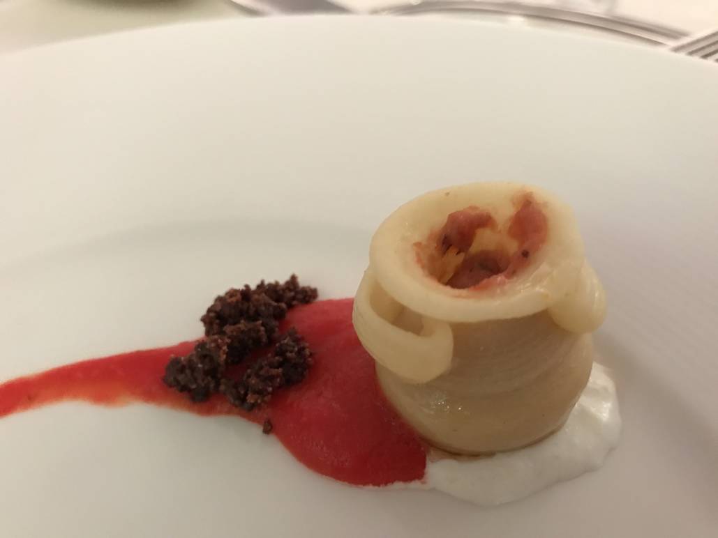 He masterfully handled the many ingredients: Mazara red shrimp, Osetra caviar, squilla mantis, clams, mussels, tuna bottarga, sea urchin eggs, cured salmon eggs, ice, guanciale, amberjack, cuttlefish and scallops. Later, when I asked how he managed such great balance of so many salty ingredients he said, “I carefully tested how much salt to put into the pasta’s boiling water. It wasn’t easy.” The dish had an amazing citrus component: the zest of Sicilian green mandarin, which Lotá’s dad, who are from a small rural town in Sicily, loved to use. The red Mazara shrimp too was classic Sicilian. In the end, the fish was exquisitely cooked, the pasta perfect, and the combinations of flavors just perfect.