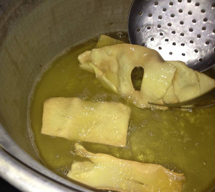 -Si fa scaldare in una pentola l'olivo e si cominciano a friggere le chiacchiere.