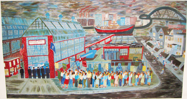 About a month ago, Paul D’Ambrosio, a colleague and Facebook friend, asked me if Ralph Fasanella’s painting Welcome Home Boys was still in the Oakland Public Library’s main branch. I live 2.5 miles from the library and visit it regularly, but I had to admit to Paul—Fasanella scholar and Chief Curator of the Fenimore Art Museum in New York—that not only had I never seen it, I didn’t even know such a painting was exhibited here on the West Coast.