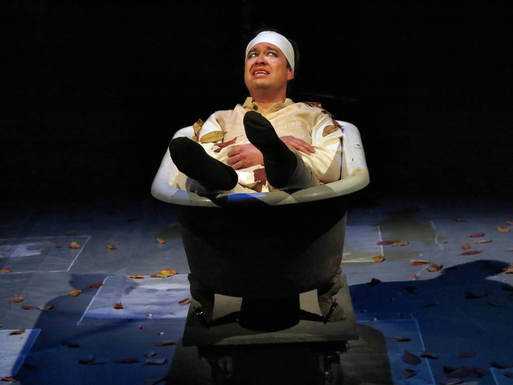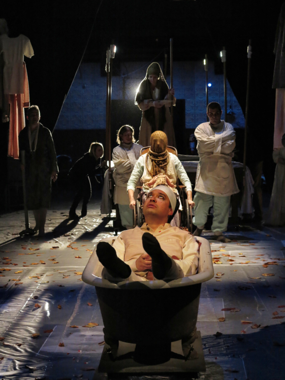 “Am I a man who cures, or a man who needs to be cured?” These are the words of Titus, words that bring to mind another Shakespearean soliloquy, uttered as he is lying in a clawfoot bathtub while holding a vial full of pills. His bandaged head, the rags he is wearing, reminiscent of a straitjacket, and his isolation immediately make the audience think of a violent prisoner or mental patient. As his hands shake, the noise of the pills becomes rhythmic as it is transformed in actual music accompanied by percussions and a multitude of sounds.