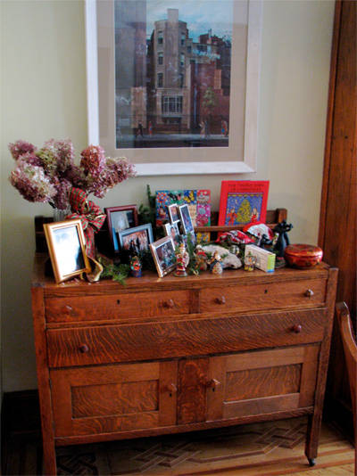 This is the Mission-style oak buffet in the living room. It looks expensive. I think we obtained it through the venerable urban practice of "dumpster diving" (tuffarsi del bidone della spazzatura) Finding good stuff in the garbage is a corollary of Boudieu's theory; "when tastes change, even good things get thrown out." My father used to bring home great things when he was a janitor in a building on Sutton Place. You'd be amazed at what rich people 'discard.' Note: poor people 'thow out' things.