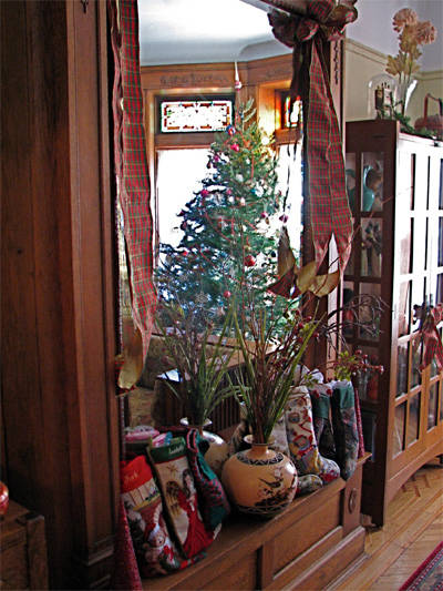 This is the mantel on the mirror in the living room. Notice that my wife has already stuffed all the Christmas stockings with small gifts she has accumulated since last Christmas. I don't get one because finding coal (carbone) in Brooklyn is difficult nowadays.