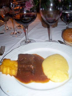 Both dishes were served with a Barbera d’ Alba “Elena” 2006 and were followed by Beef braised in Barolo wine with two forms of polenta, loose and crisp. For this course the wine offered was an aromatic Barolo “Rocche” 1999.
