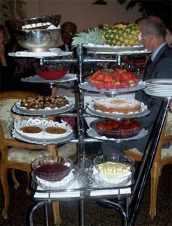 Finally, two carts with multiple choices of desserts. We tried the baked pears, delightful with the creme zabaglione, while sipping a Moscato d’ Asti “Salatio” 2007, a sweet and effervescent dessert wine.
